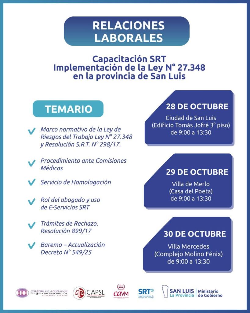 Organizan: CAPSL – Colegio de Abogados y Procuradores de San Luis, CAVM y la Superintendencia de Riesgos del Trabajo, con el acompañamiento del Ministerio de Gobierno de San Luis.