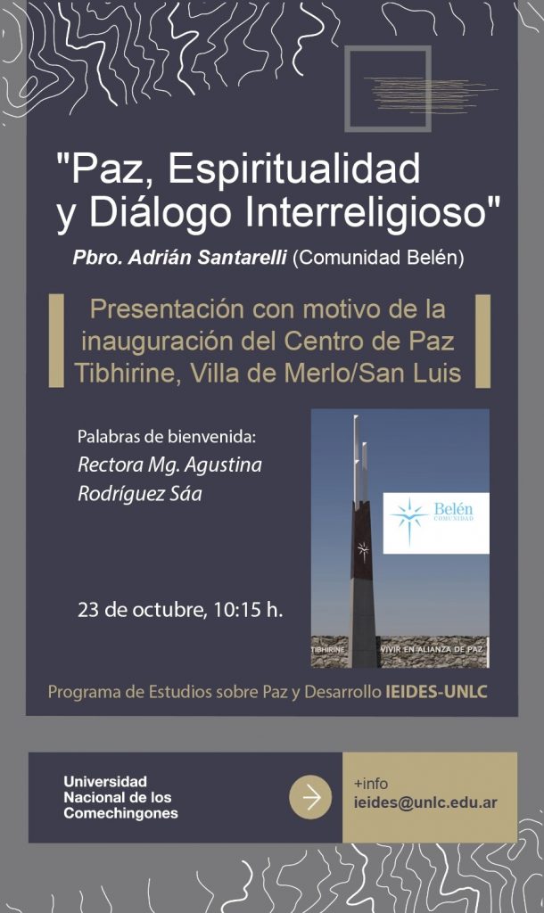 Con motivo de la inauguración del Centro de Paz Tibhirine, en nuestra Villa de Merlo, el día jueves 23 de octubre a las 10:15 en el Aula Magna del Edificio Académico, se llevará a cabo la presentación “Paz, Espiritualidad y Diálogo Interreligioso”, a cargo del Pbro. Adrián Santarelli, fundador de la Comunidad Belén y precursor de este nuevo espacio cultural abierto a todas las personas, que busca abrir las puertas al diálogo y al conocimiento de las raíces profundas de la paz, tanto a nivel personal como colectivo.