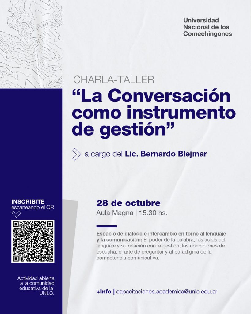 La Universidad Nacional de los Comechingones invita a toda la comunidad universitaria, estudiantes, docentes y nodocentes, a participar de la Charla–Taller “La conversación como instrumento de gestión”, a cargo del Bernardo Blejmar.