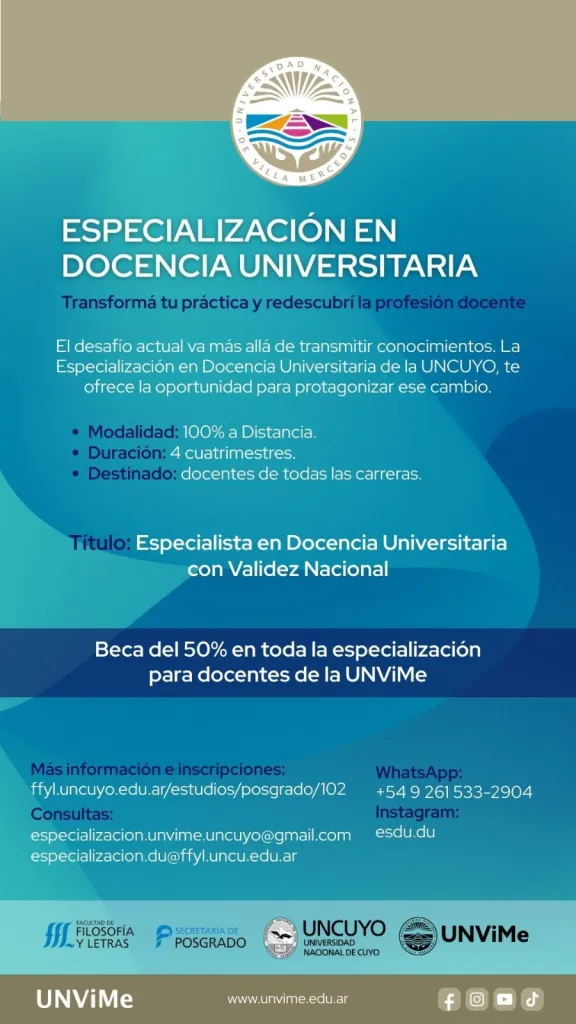 En el marco del convenio con la Facultad de Filosofía y Letras de la Universidad Nacional de Cuyo (UNCuyo), se ofrece a nuestros docentes la posibilidad de cursar la Especialización en Docencia Universitaria (ESDU), una carrera de posgrado acreditada por CONEAU (Resolución Nº 120/2017). Inscripciones abiertas, con inicio de la cursada el próximo 1° de abril.