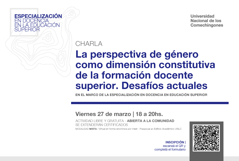 La Universidad Nacional de los Comechingones invita a la comunidad a participar de la charla abierta “La perspectiva de género como dimensión constitutiva de la formación docente superior. Desafíos actuales”, parte de la cursada de la Especialización en Docencia en Educación Superior.